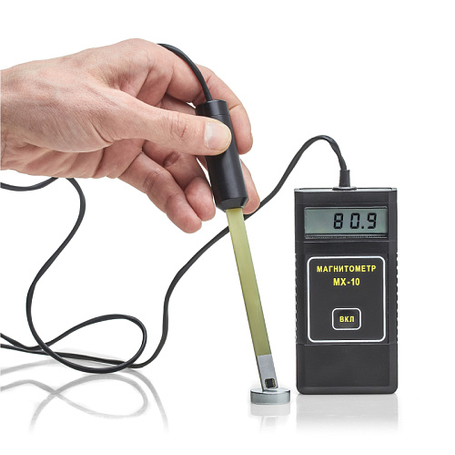 Магнитометр МХ-10 представляет собой электронный измерительный блок с выносным измерительным преобразователем, в основе работы которого лежит эффект Холла. Конструкция прибора позволяет измерять как нормальную, так и тангенциальную составляющую вектора магнитной индукции непосредственно на поверхности детали. Измеренное значение величины индукции магнитного поля выводится на цифровой индикатор электронного блока.